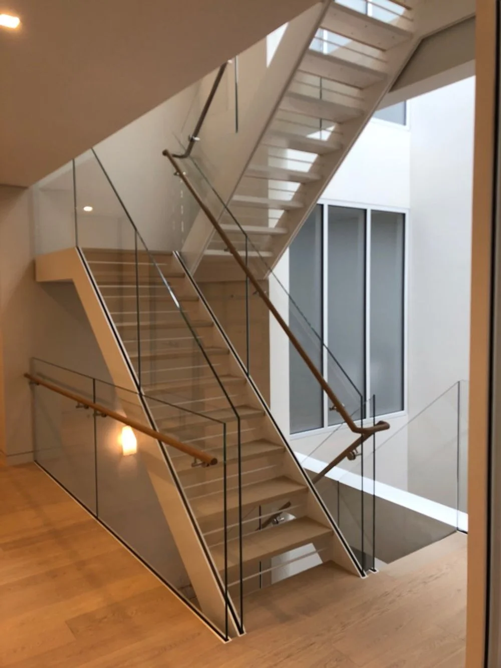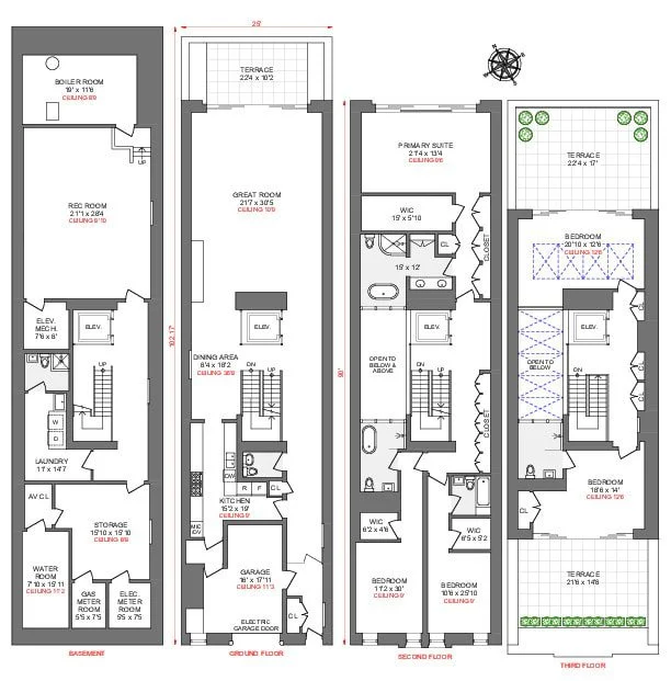 The cellar was excavated to create a space that contains almost all of the support and storage requirements of a contemporary New York townhouse. The rooms are arrayed around a central light core topped by an extensive skylight that floods the interior with sunlight. The stairs are visually minimized with a continuous ribbon of steel and glass that adjoins an all-glass elevator enclosed behind tempered glass, allowing light to flood the interior. The first floor contains the garage and the public spaces of Living, Dining, Breakfast Room and Kitchen and is connected to the entryway by a long art gallery running from front to back. The second floor has bedrooms and bathrooms and the top floor has a study and exercise/guest room under sloped ceilings and flanked with rooftop spaces. The back elevation is carefully articulated in brick, bluestone, limestone and glass to echo the nearby backyards and creating a simple façade for the neighbors to look at.