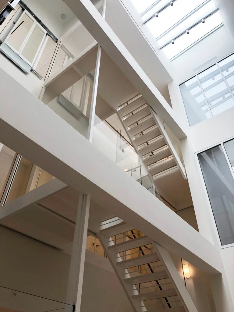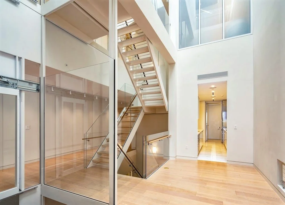 Encompassing over 8,000 square feet, this minimalist house was created to be a gallery for display of the owner’s extensive art collection. Sited in a heavily-regulated Landmarks Preservation District, this carriage house has been repurposed as a residence and has an additional floor created by lowering the floor-to-floor height and offsetting the roof back from the street front.